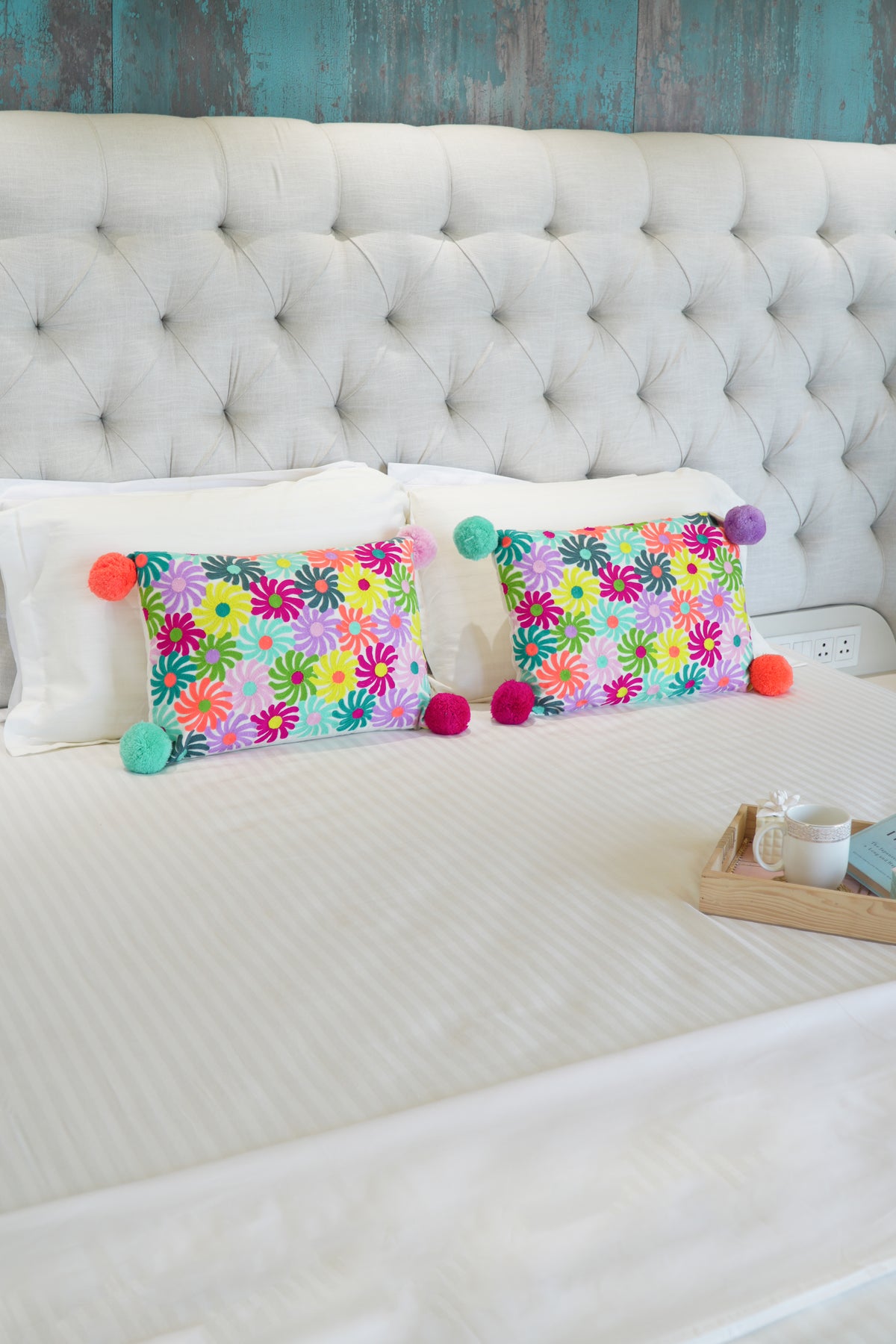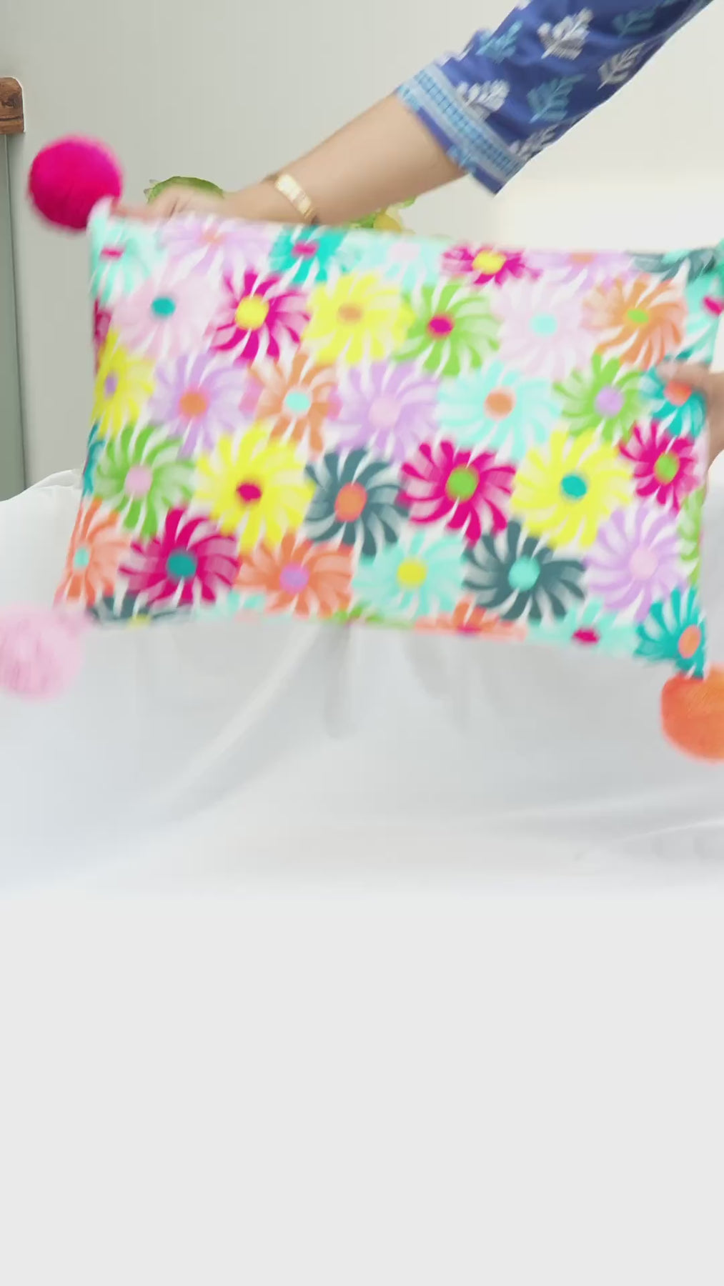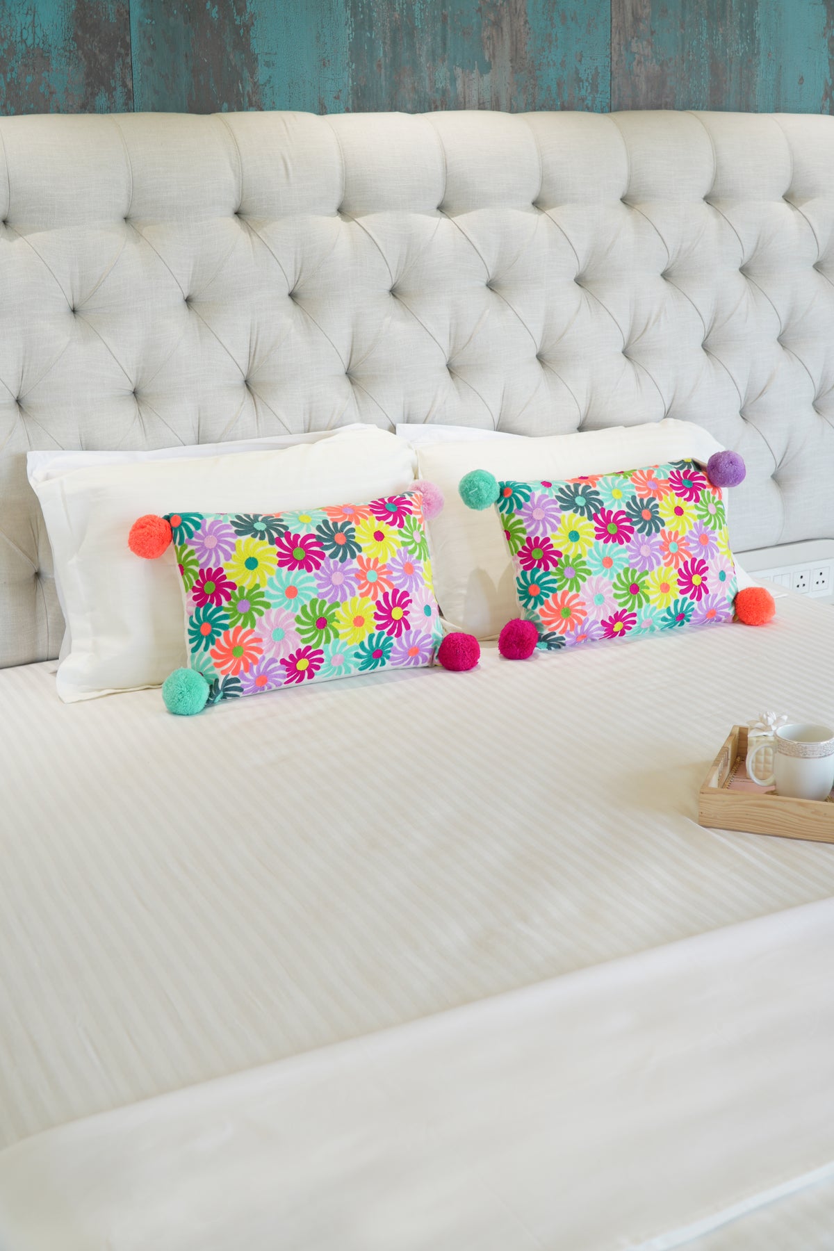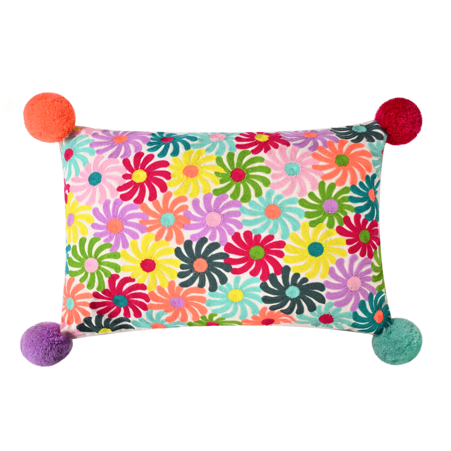 Multi color Spiral embroidered Lumbar cushion cover in pure cotton casement fabric to elevate your spaces. A delightful design for your interiors.