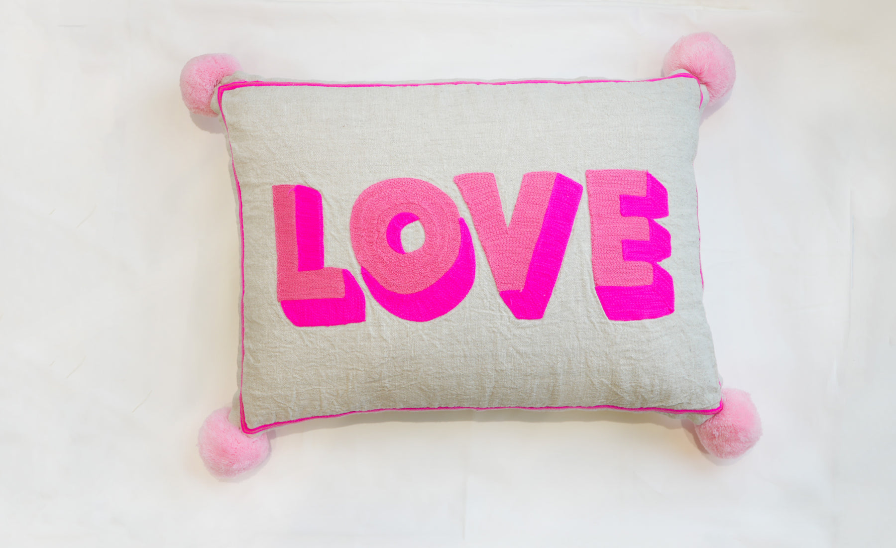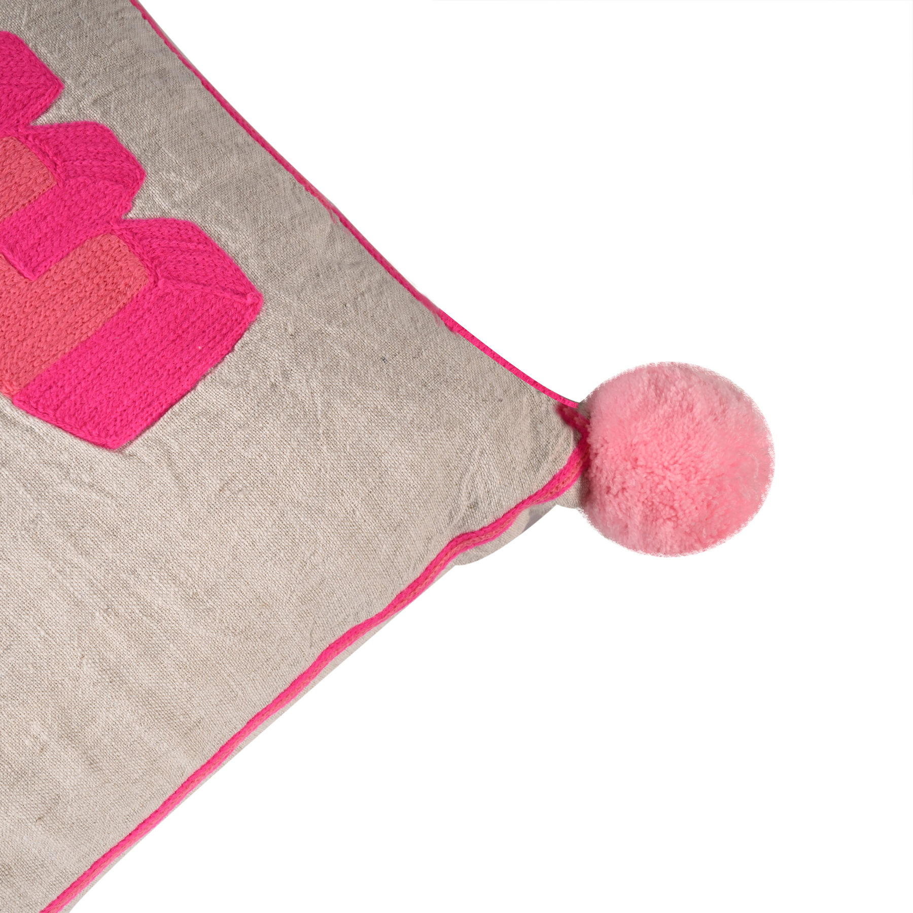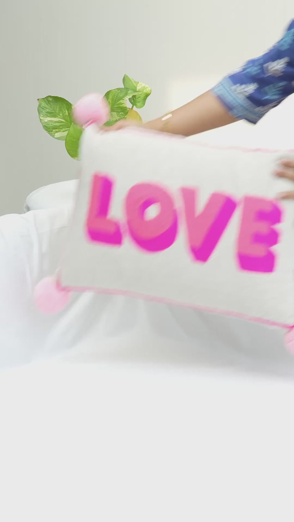 A beautifully embroidered LOVE design cushion cover in pure Linen fabric in vibrant shades of Pink to elevate your spaces.