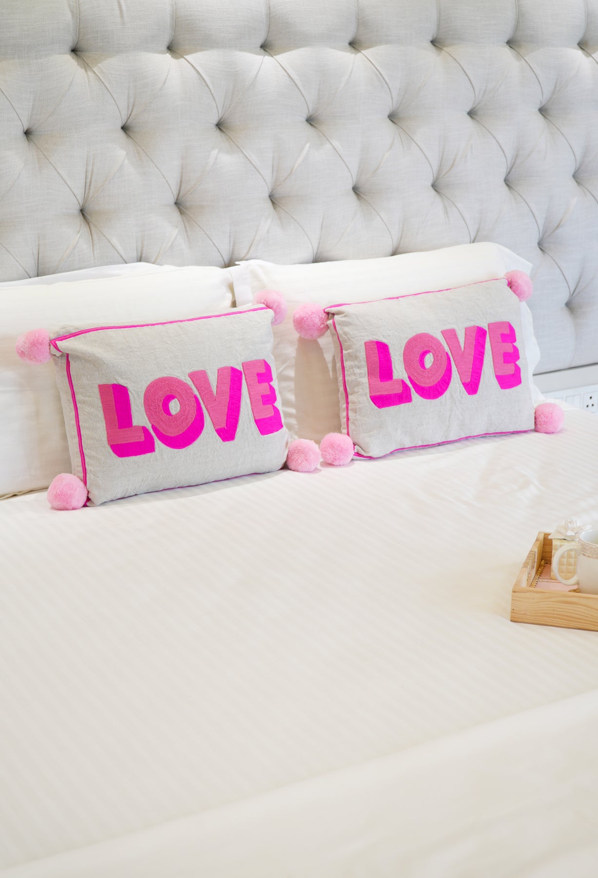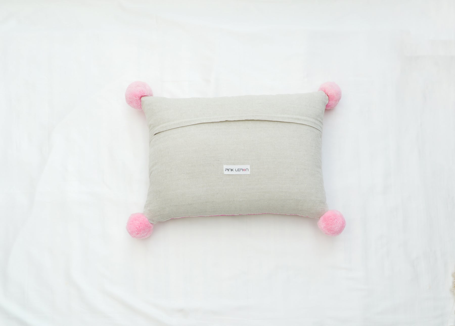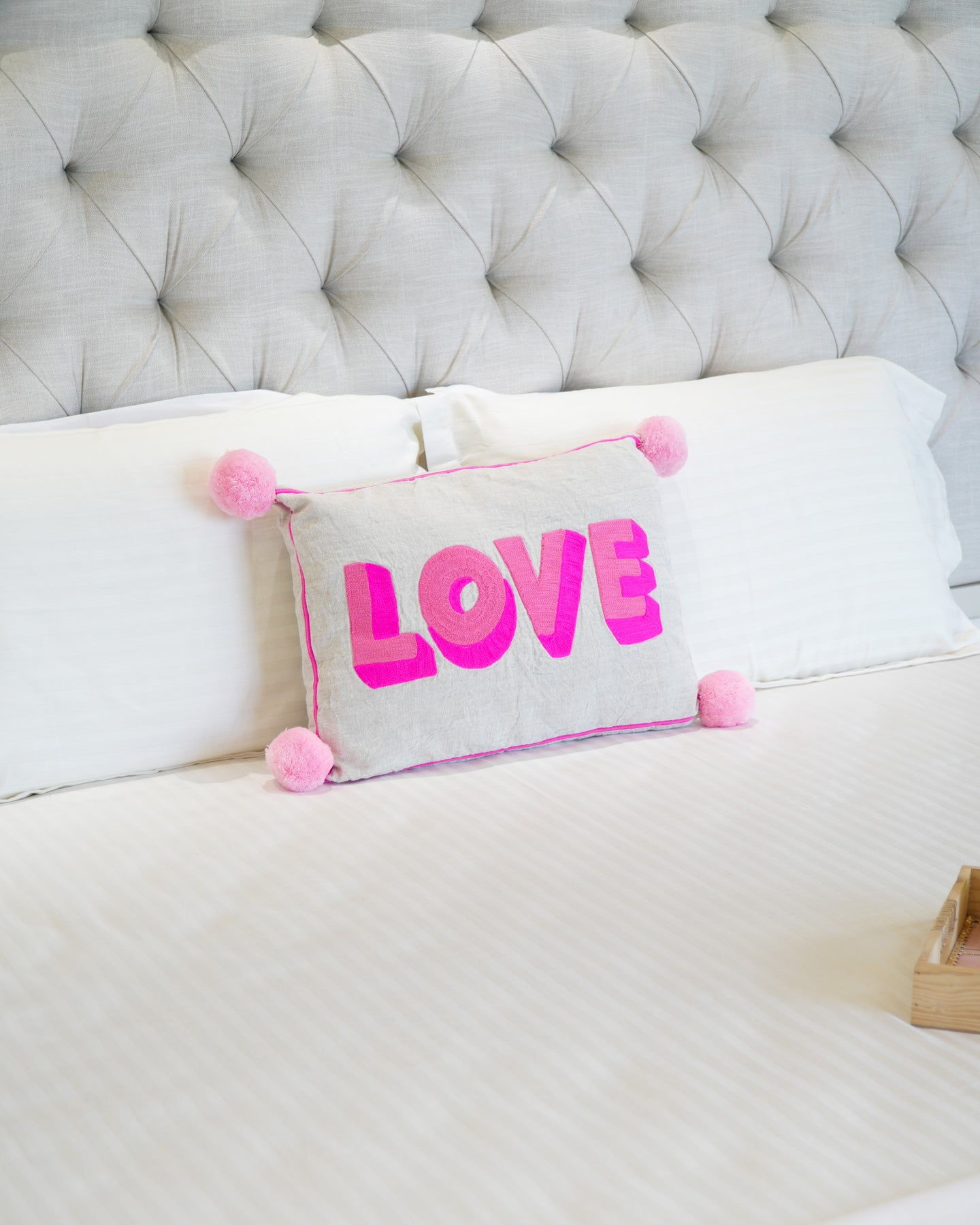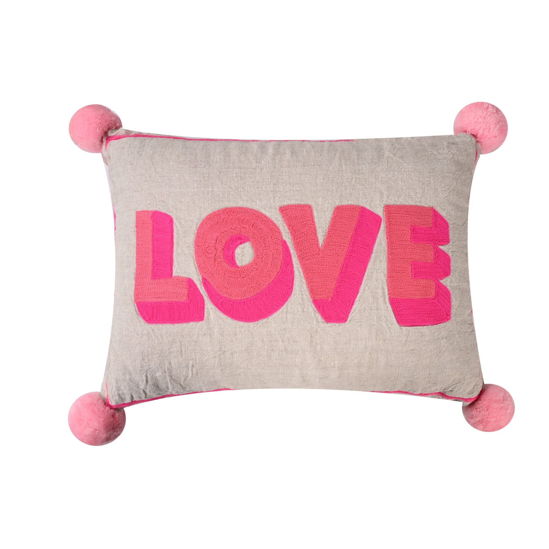 A beautifully embroidered LOVE design cushion cover in pure Linen fabric in vibrant shades of Pink to elevate your spaces.